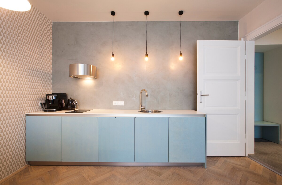 Alójate en Praga rodeado de lujo, arte y diseño. Un lugar elegante y tranquilo con todas las comodidades necesarias te abrazará cálidamente y permitirá una vida cómoda en la parte residencial más atractiva de la ciudad. Estamos deseando recibirte para tu estancia de media o larga duración. La suite está bien equipada y te da la bienvenida con una gran cocina y comedor, TV moderna con Apple TV, O2 TV y servicios de Netflix, dormitorio muy privado y acogedor (colchones de lujo, edredones de primera calidad) y material para hacer ejercicio como esterilla de yoga, mancuernas o cuerda para saltar.