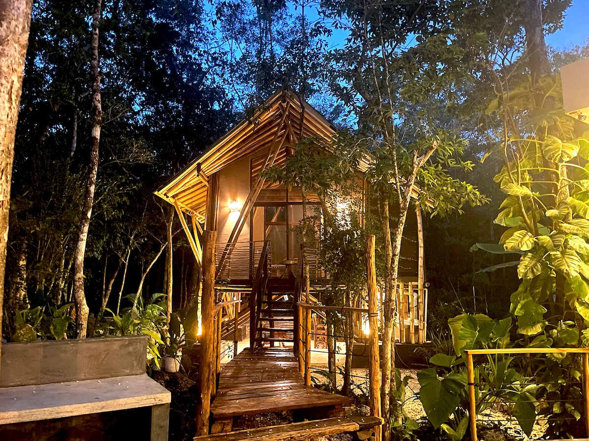 No availability? Other treehouses on Host Profile. Enjoy this unique Jungle Treehouse Experience in the tree tops. The Canopy treehouse is intentionally elevated (height: 6 Mts/20ft) and shaped amongst the trees. A spacious Eco dome gives you all the comfort of Glamping: King bed, private bathroom & HIGH SPEED fan. Relax in nature, swing the hammock enjoying the views or gaze at the stars. The property is located 10-15 MIN DRIVE from different beaches of Tulum & a short stroll to nearby cenotes.