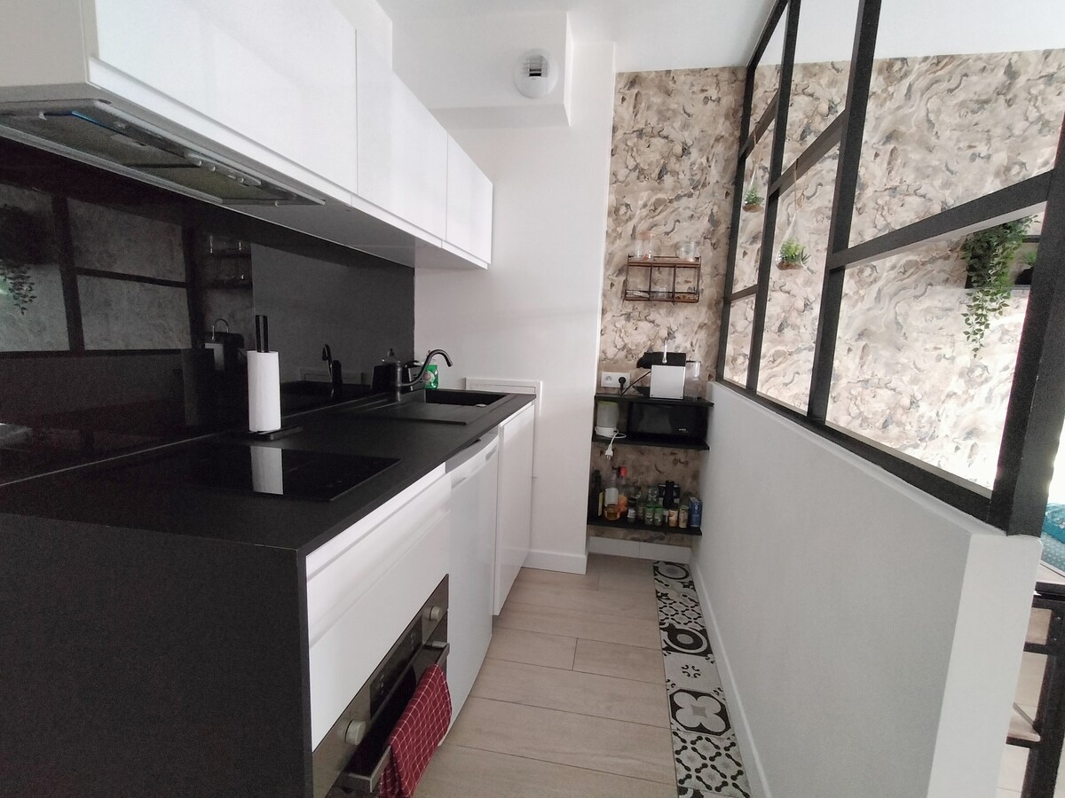 ✨Magnífico apartamento con aire acondicionado con jacuzzi, sauna y terraza idealmente situado a las afueras de París, estación de tren RER C a 100 metros y metro LÍNEA 7 a 5 minutos a pie🚶. A su disposición: - jacuzzi y sauna privados - Habitación con cama doble KING SIZE (180 cm) - Cocina americana equipada: nevera, placas de inducción, microondas, cafetera NESPRESSO , hervidor de agua - Terraza acogedora - Cuarto de baño con ducha a ras de suelo - Se proporcionan sábanas, albornoces y toallas