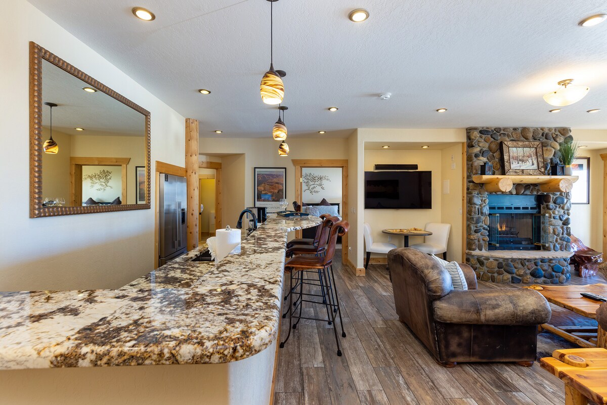 ¡La comodidad de la calle principal se une a la aventura en la montaña! En nuestro condominio, a menos de 1 minuto a pie del autobús gratuito Summit Stage Ski y también de la encantadora calle principal de Frisco para restaurantes, cafés y tiendas. El après-ski encuentra su escenario perfecto en el condominio, con dos acogedoras habitaciones, ducha principal de doble cabezal, cortinas opacas, cocina recién remodelada, chimenea de leña, sala de estar hundida enmarcada por vistas a la montaña, porche trasero privado a nivel del suelo con asientos, lavadora/secadora, 2 lugares de estacionamiento dedicados