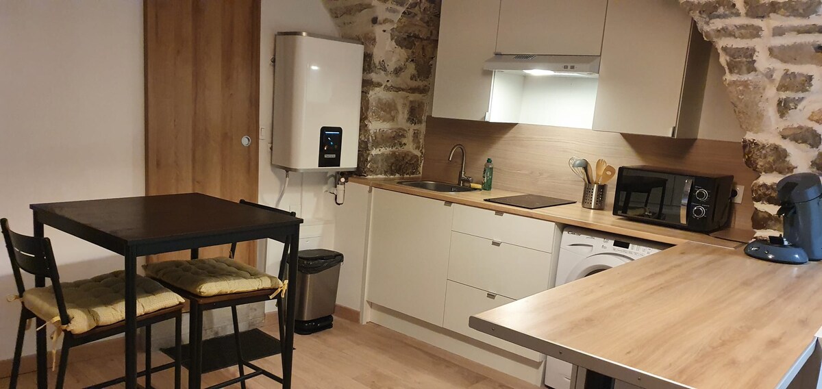 Estudio independiente en casa de pueblo. Agradable estudio de unos 20 m². Ofrecemos una cama de 140 cm, un baño, una cocina recién equipada, una zona de descanso con dos sillones y una mesa de centro para el café, la lectura, etc. Alignan es un pequeño pueblo idealmente situado a 8 minutos de Pezenas, a 20 minutos de Béziers, a 20-25 minutos de las playas, a 10 minutos de la autopista y a 45 minutos de Montpellier. El pueblo tiene todas las comodidades y es muy activo culturalmente.