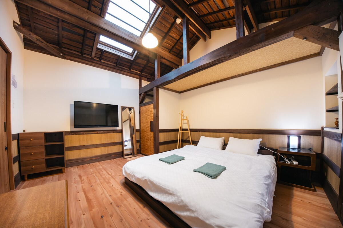 Renovated by your host - a woodworker and designer residing in Osaka - Traditional shikui plaster walls, exposed beams, cypress floors, shoji paper screens, a morutaru bathroom, horigotatsu table, and a hidden ninja door… Featuring a queen bed in the master bedroom, and 5 futon setups for the tatami room and the loft. 2 stations within 5-10 mins walk allow direct access to Umeda / Osaka station (4 mins), and Namba (9 mins)