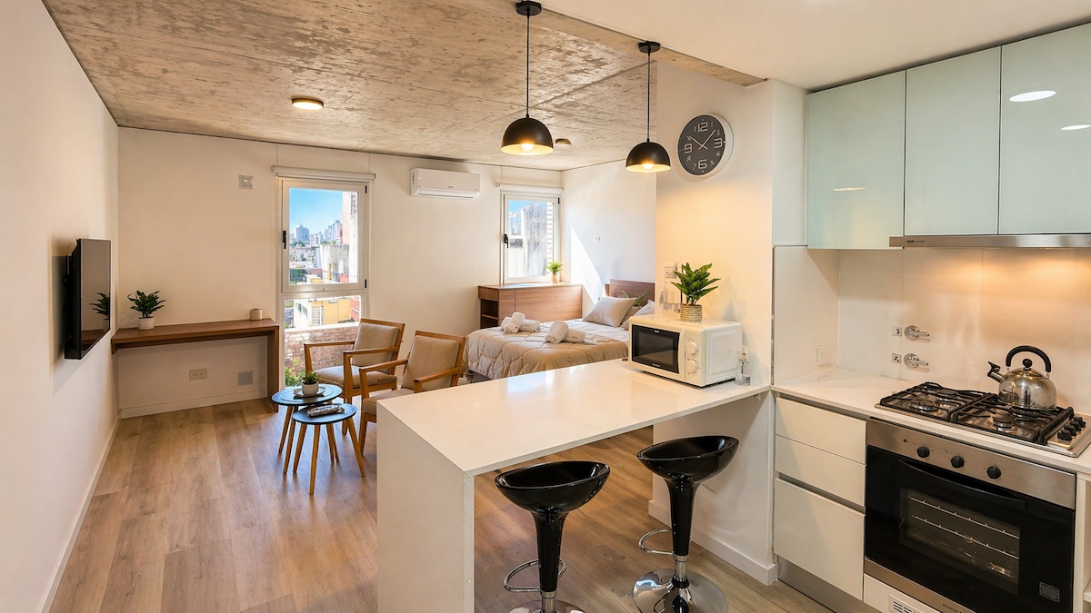 Loft en Fisherton moderno con cama matrimonial y sofá cama de una plaza, perfecto para hasta tres personas. Cuenta con un comedor diario y cocina integrada. El loft tiene mobiliarios de diseño y electrodomésticos nuevos. Ubicado a pocos minutos del centro de Fisherton, del Aeropuerto y del centro comercial, el edificio ofrece pileta, jardín, parrillero y cochera privada con control automático. Ideal para una estancia cómoda y segura. ¡Reserva ahora!