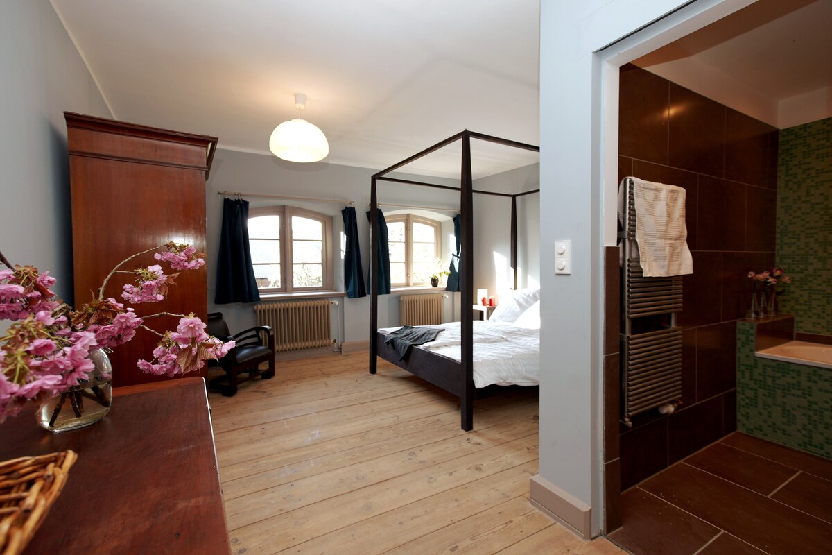✨ Spacious 110 m² apartment in a historic manor house with fireplace, sauna, and 6000 m² garden ✨ ➝ 2 bedrooms with en-suite bathrooms ➝ Rain showers and bathtub ➝ Wood-burning stove for cozy evenings ➝ 6000 m² garden with fire pit and barbecue ➝ Outdoor sauna for 6–8 people ➝ Electric charging stations directly at the house ➝ Dogs welcome ➝ Café & restaurant in the house ➝ Swimming lake only 2.5 km away