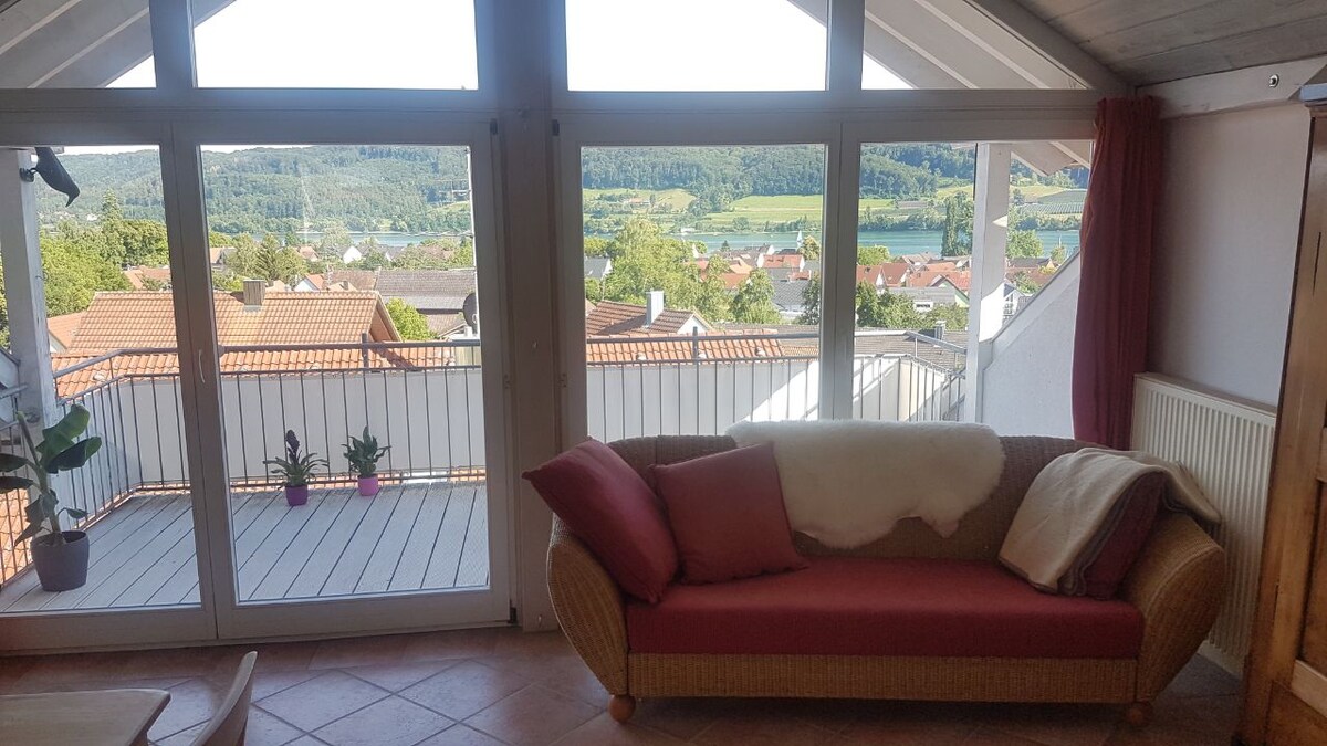 Neu sanierte Design-Wohnung mit Terrasse & Garten, separatem Eingang und kostenlosem Parkplatz. Terrassenmöbel & Garten neu 2026! Fussbodenheizung sorgt auch im Winter für höchsten Komfort. Ruhig gelegen mit Seeblick, ideal zum Abschalten. Zentral am Bodensee: Stein am Rhein 10 Min · Rheinfall Schaffhausen 34 Min · Konstanz 35 Min · Zürich 57 Min. Thermen, Schlösser, Skigebiete & Alpen schnell erreichbar.