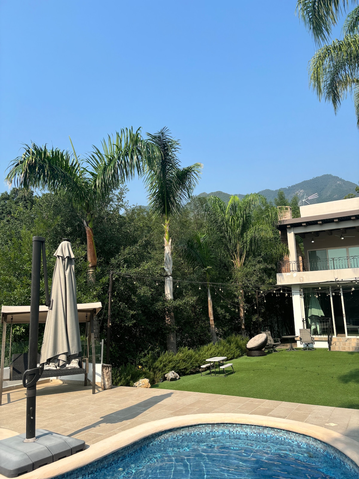 Nuestra casa, de construcción moderna, está escondida en el bosque, a solo 3 km de la cascada de la Cola de Caballo. Ubicada dentro de un fraccionamiento cerrado, es ideal para descansar y compartir con amigos mientras disfrutan de espléndidas vistas. Ideal para parejas, aventureros, grupos de amigos (máximo 8) y familias. Cuenta con una amplia terraza, espacios interiores amplios con techos de doble altura. Fresca en el verano, cálida en invierno; una casa hecha con amor en cada detalle.