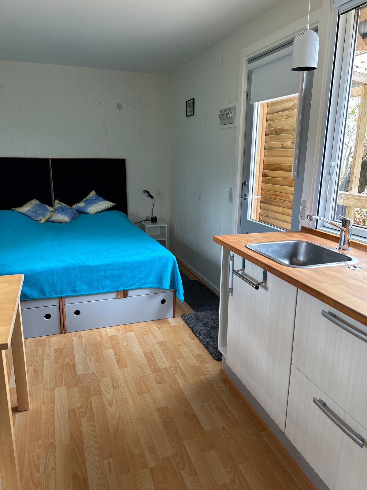 Oportunidad única de alojarse directamente en el muelle y a solo 3 metros de la orilla del agua en el icónico edificio de Bjarke Ingels en la recién construida Aarhus Ø. Wifi y plaza de aparcamiento privada incluidos. Cuando hace buen tiempo, el paseo marítimo está justo fuera y es muy concurrido. Agradable y bien aprovechado baño con altillo. Fantástica, orientada al sur, con vistas panorámicas de 180 grados al agua, al puerto y al horizonte de la ciudad. Pequeña sala de estar cuando es lo mejor: perfecta para parejas o viajeros de negocios. Cocina con hervidor eléctrico y nevera, no es posible cocinar.