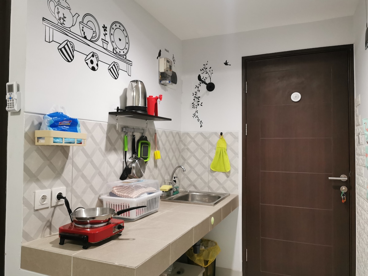 Wifi disponible las 24 horas. Puedes disfrutar de tus días aquí con programas de televisión inteligentes. Estar en la planta 23 te da una gran vista de la ciudad de Bandung y de la montaña. Utilizamos un sistema de auto check-in. Tendrás una tarjeta de acceso para acceder al ascensor y un código PIN para la puerta principal que solo es válido durante tu estancia.