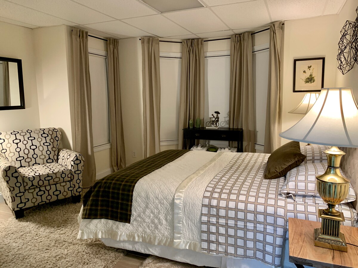 Nuestra suite King Bear es una unidad privada que incluye una sala de estar y una cocina pequeña con dormitorio separado y baño privado con ducha a ras de suelo y bañera de inmersión. Ubicada a tres manzanas del corazón del centro de Gatlinburg. Disfruta del amanecer o la puesta de sol desde nuestro porche delantero. Es el lugar perfecto para que parejas y personas se relajen y disfruten de hermosas vistas de las Smoky Mountains y sus alrededores. Aparcamiento gratuito junto a tu alojamiento. Totalmente accesible para personas con discapacidad, incluida la ducha. No hay escalones hasta tu suite.