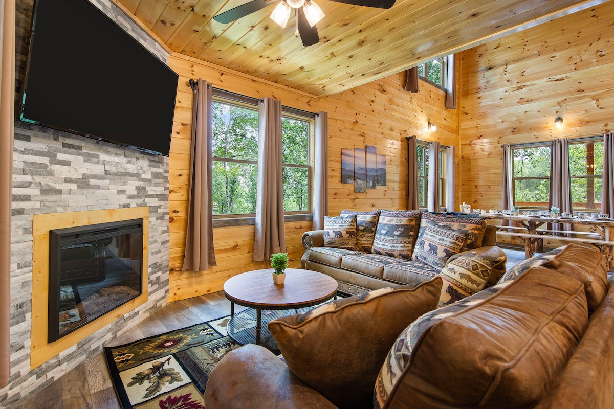 ¡Descubre por qué esta cabaña está en el Top 5% en Airbnb! ¡Hermoso, a 1 milla de Parkway y la isla! 2 espaciosas suites King Master para una noche de descanso. ¡2 baños privados completos, sofá cama, sauna, jacuzzi, sala de juegos y chimenea! MUCHAS comodidades. Te encantará este nivel abierto de 1 nivel y 3 juegos de puertas francesas al balcón privado. Relájate en el porche delantero con vistas al valle o disfruta del jacuzzi en el gran espacio del patio trasero. La sala de estar tiene techos altos y una acogedora chimenea para un retiro.