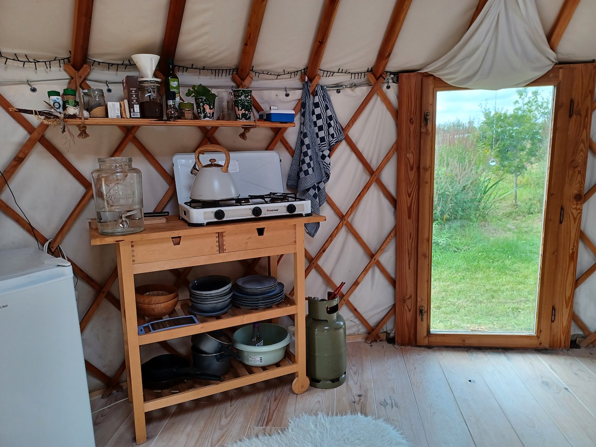 This Yurt is a warm and colourful retreat for two, set in a wide meadow in the heart of nature. Sleep beneath the stars, wake to birdsong, and enjoy peace, privacy and comfort. With a wood stove and private outdoor facilities (eco toilet and hot shower) it’s the perfect place to slow down, reconnect, and enjoy each season. Whether you're here to relax, explore, or simply be, this yurt offers a unique stay full of charm and tranquility.