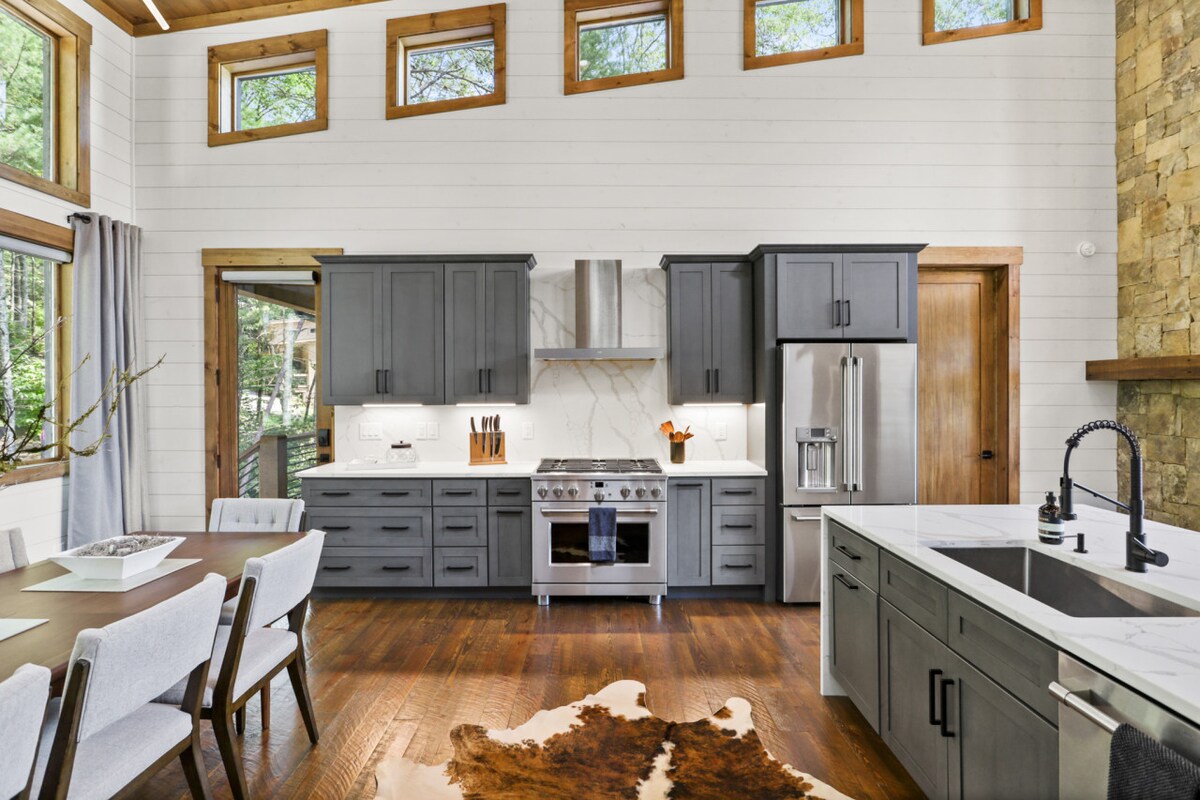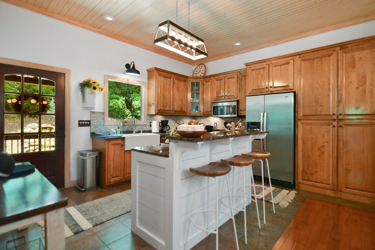 Escápate al lujo en esta impresionante cabaña de montaña Blue Ridge, a solo 5 minutos de DT. Disfruta de vistas de largo alcance, 4 chimeneas de piedra, amplias terrazas, un jacuzzi y un nuevo espacio al aire libre con fogata, putting green y hamaca. Las características incluyen una cocina bien equipada, una barra húmeda, un cargador para vehículos eléctricos, sábanas limpias y un detallado kit de inicio de artículos básicos para que tu estancia sea fácil y sin preocupaciones. Tranquilo pero conveniente, es el refugio perfecto para la relajación, el entretenimiento y la naturaleza.