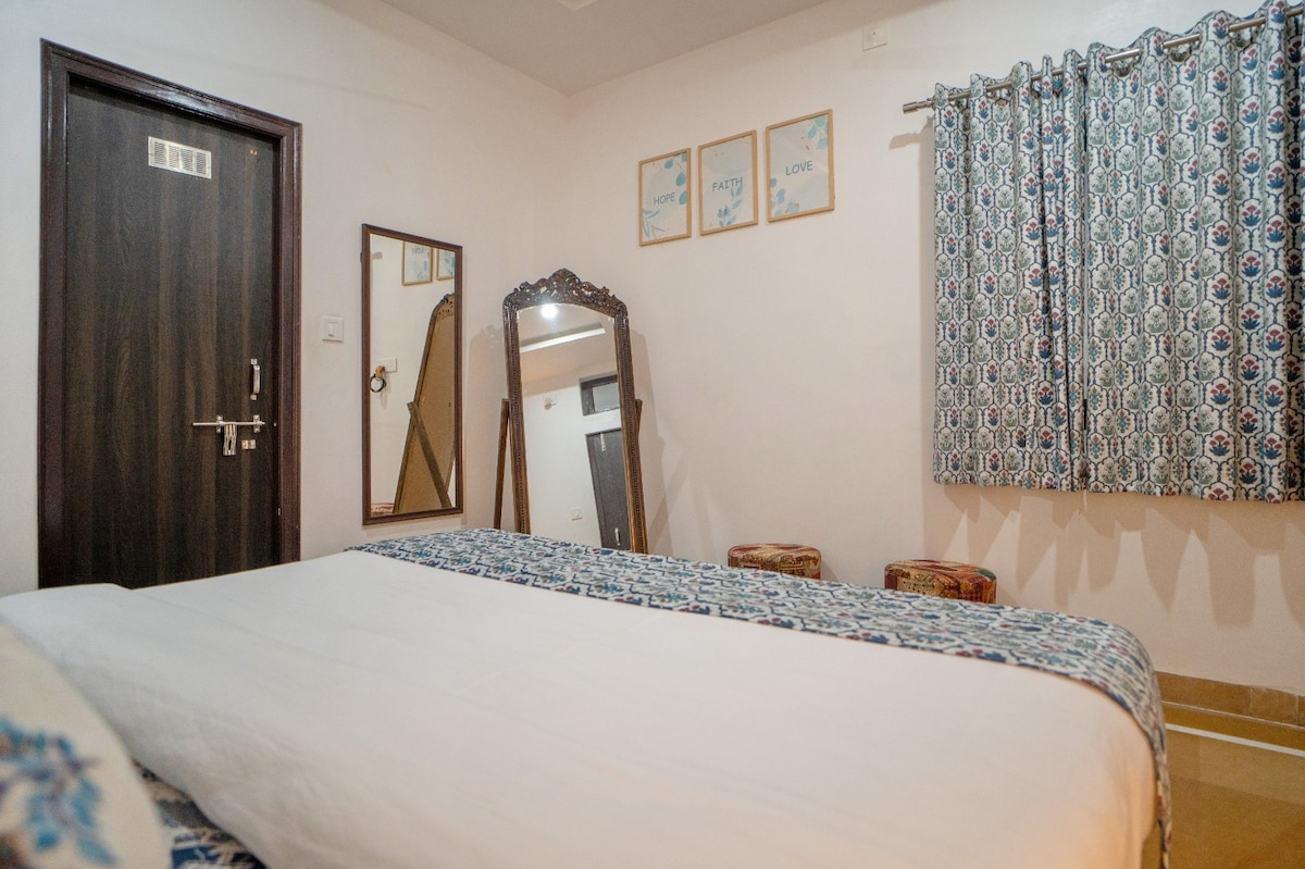 Stylish private room near Fatehsagar Lake, Udaipur, with modern boho beige interiors for couples and solo travellers. ✅ Smart TV ✅ Steps away from Fatehsagar Lake ✅ All Major attractions just 15-20 Min away ✅ Hot water in bathroom ✅ Daily Cleaning ✅ Towels/Shampoo/Body Wash ✅ Power Backup Inverters ✅ Kitchenette ✅ Hairdryer ✅ Water Purifier RO ✅ Wifi ✅ Iron