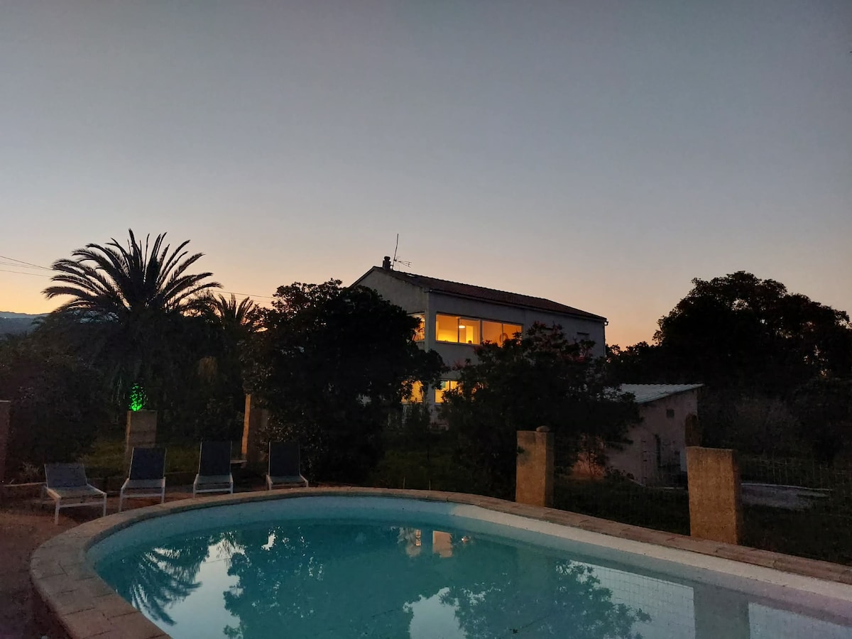 Demeure de charme en pierre de la région entièrement construite par le propriétaire respectueuse de l'environnement entre mer, montagne et piscine (classement 5 étoiles ). A 5 mn des fameuses Gorges de l'Asco, rivière, cascades . A 25 mn des plus belles plages de Balagne, Ostriconi, Lozari. Dans un site préservé, au calme absolu avec une vue superbe .Ce logement est parfait pour une escapade en amoureux avec un accès privatif à la piscine à débordement des propriétaires. Internet fibre