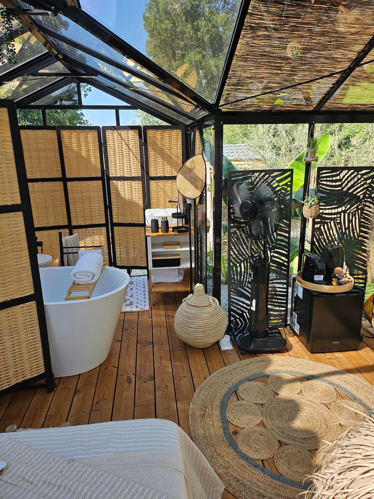 Disfrute del encantador entorno de este alojamiento romántico totalmente acristalado en total inmersión en un exuberante jardín...para encontrar la calma y la serenidad Equipada con aire acondicionado y ventilador nebulizador para mayor comodidad Un mosquitero, un minibar y una zona de café Para una experiencia insólita... a menos de 5 km de la playa más cercana del pueblo y de las tiendas Jacuzzi de masaje cesta gourmet aperitivo o desayuno disponible bajo reserva