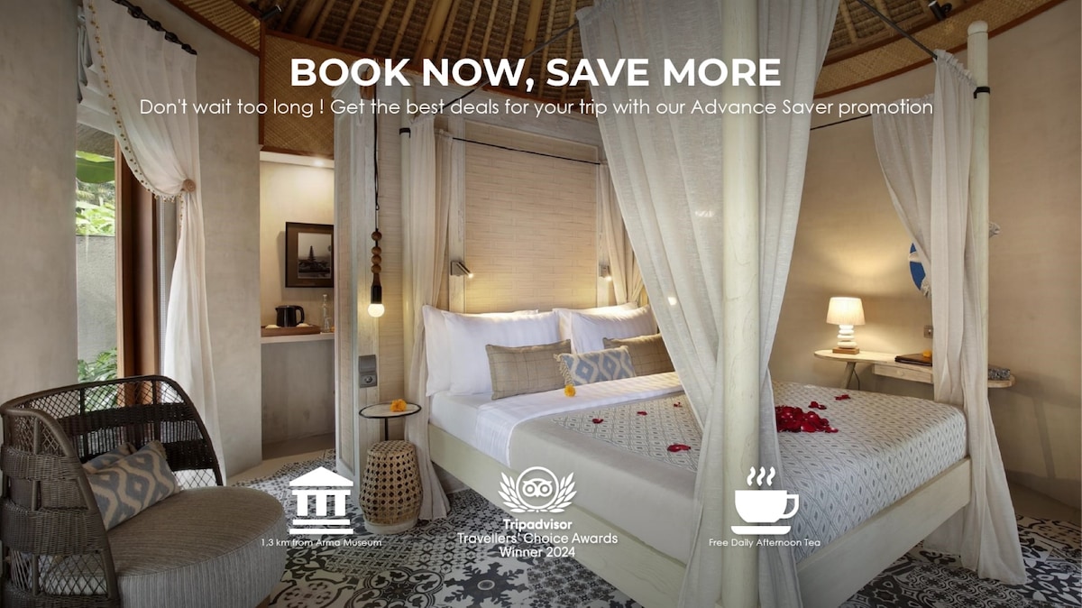 Lanai Room a serene oasis nestled in the heart of Ubud's lush landscapes. Our Lanai Room offers a harmonious blend of contemporary comfort and traditional Balinese elegance, providing an intimate retreat for those seeking tranquility. The room's decor is inspired by the rich cultural heritage of Bali, featuring handcrafted furnishings, local artworks, and a soothing color palette that reflects the natural beauty surrounding the property.