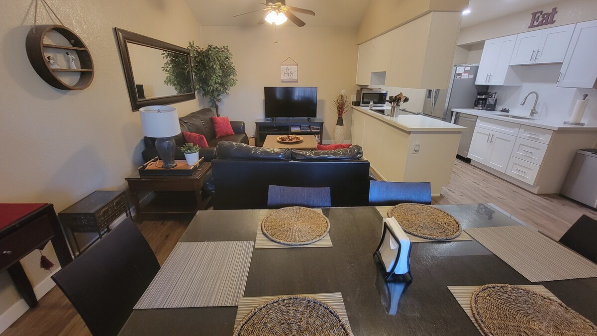 ¡Apartamento llave en mano! ¡Apartamento de 2 dormitorios bellamente reformado en una zona muy tranquila de East Mesa! Aire acondicionado nuevo, lavadora-secadora en la unidad. Todo lo que necesitas para tu estancia: sábanas, toallas, platos, todos los utensilios de cocina que puedas imaginar, 2 televisores montados en la pared, internet de alta velocidad. ROKU en la sala de estar y el dormitorio principal, con YouTube TV, Prime, Hulu y otros, todos activos. ¿Eres exigente con tus almohadas? ¡Te tenemos cubierto, con almohadas planas, estándares y mullidas «Black Label»! Tranquila unidad de abajo, en la parte trasera de un pequeño complejo.