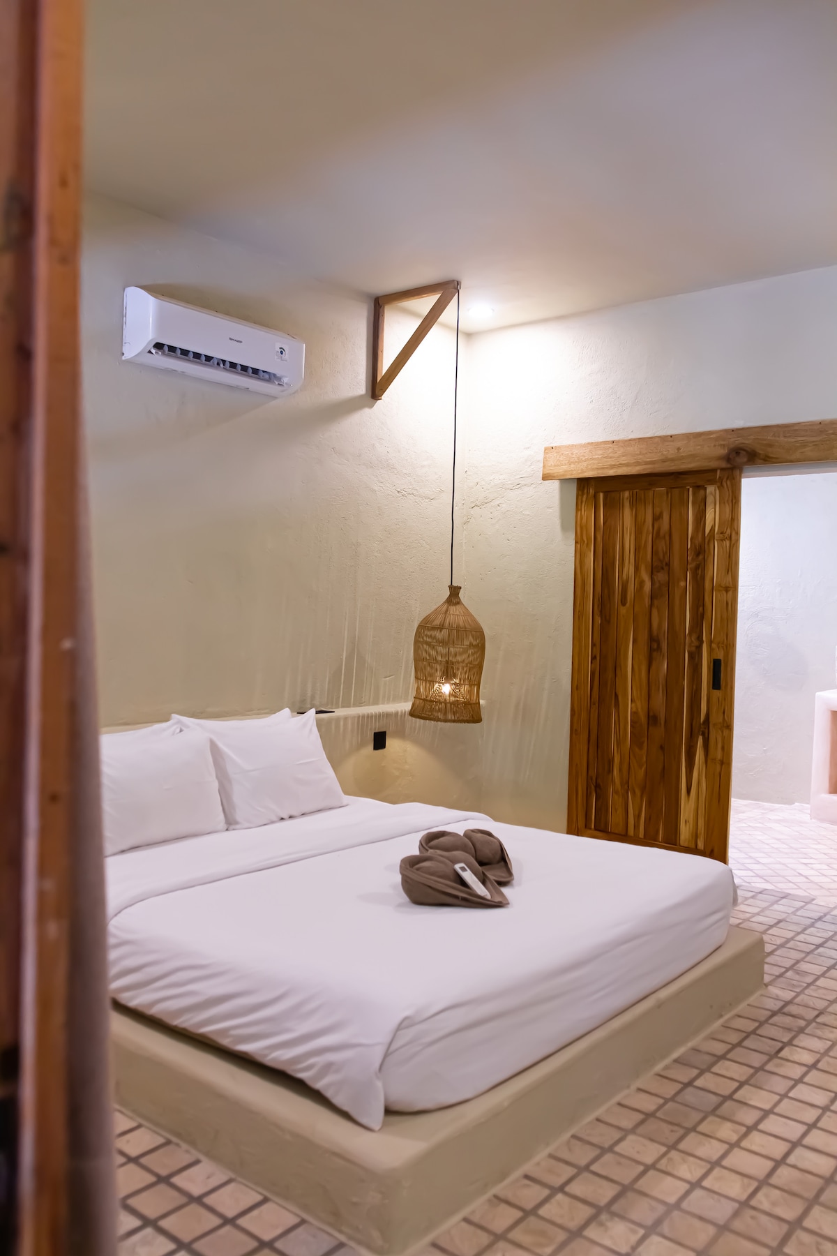 Nuestras cabañas de estilo boho cuentan con un baño interior privado con ducha a ras de suelo, una cama tamaño king y un jardín privado para la máxima relajación. Disfruta de la gran piscina con pufs y tumbonas, y visita nuestro bar para desayunar (incluido) o tomar una bebida refrescante. La decoración es ligera, acogedora y bohemia, con muchos cojines para mayor comodidad.