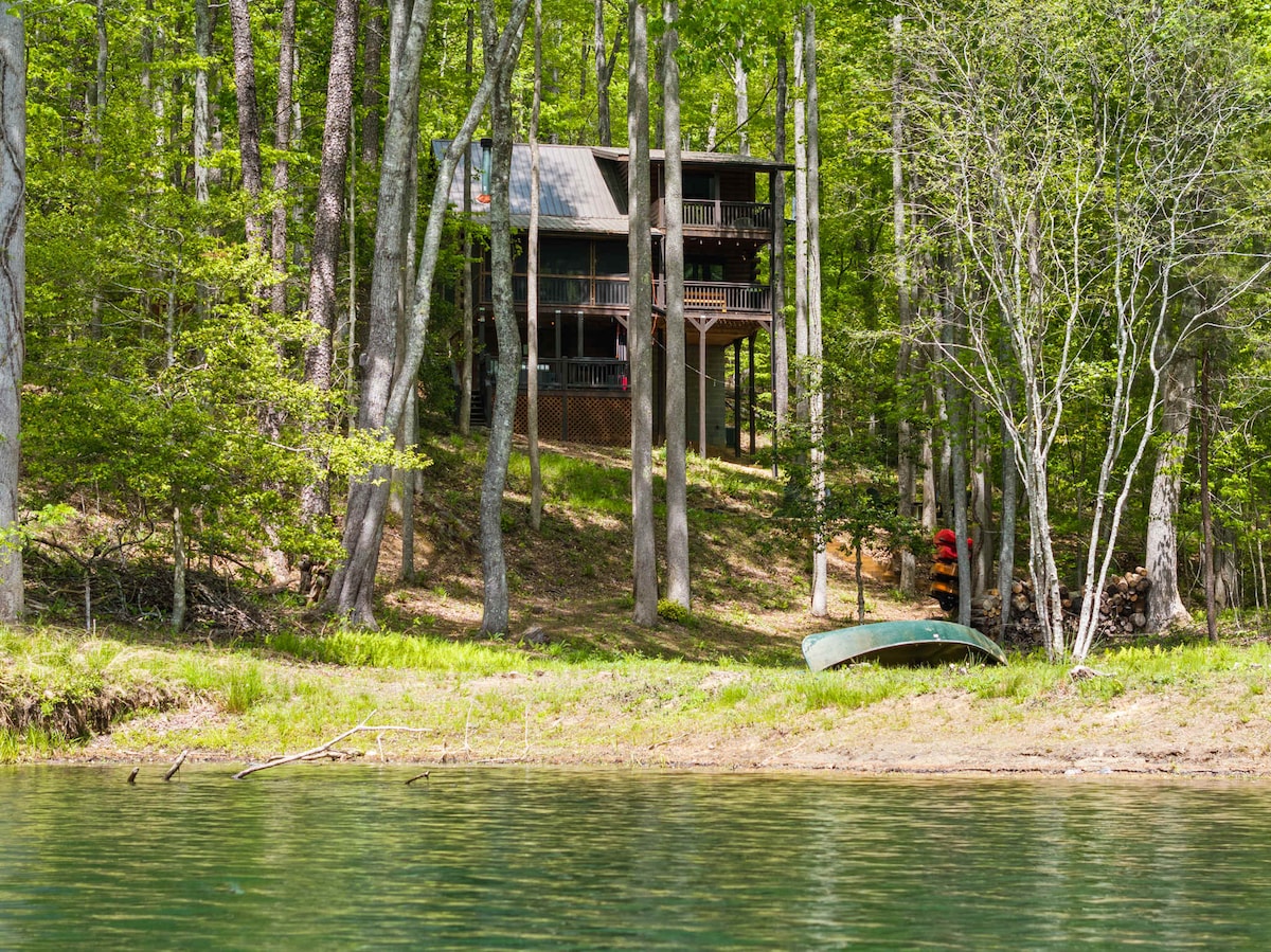 Disfruta de vistas al lago y a la montaña en este oasis actualizado entre los árboles. Tanto si buscas una aventura al aire libre como una escapada rejuvenecedora, ¡lo tenemos todo! Situado en un lago de cinco acres, disfruta del muelle privado y del uso de nuestras dos tablas de remo y canoa. Después de un día de senderismo, desconecta en el jacuzzi y la sauna. Hay mucho espacio para reunirse tanto en el interior como en el exterior. Esperamos que disfrutes de todas las comodidades modernas mientras te reconectas con la naturaleza. ¡A solo 12 minutos del centro de Ellijay!
