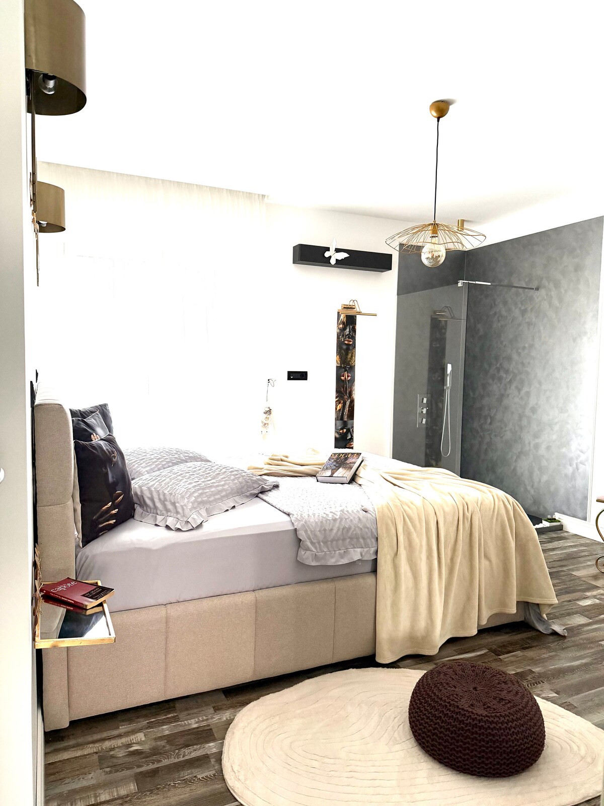Welcome to our one-of-a-kind studio apartment close to the heart of the city. Our apartment got a grand mirror that not only adds depth to the room but also creates an illusion of boundless space. As you gaze upward, be mesmerized by the enchanting LED lights embedded in the ceiling, casting a gentle glow that sets the perfect ambiance for any occasion. These ceiling LEDs add a touch of sophistication and warmth to your experience. Promising an unforgettable urban retreat.