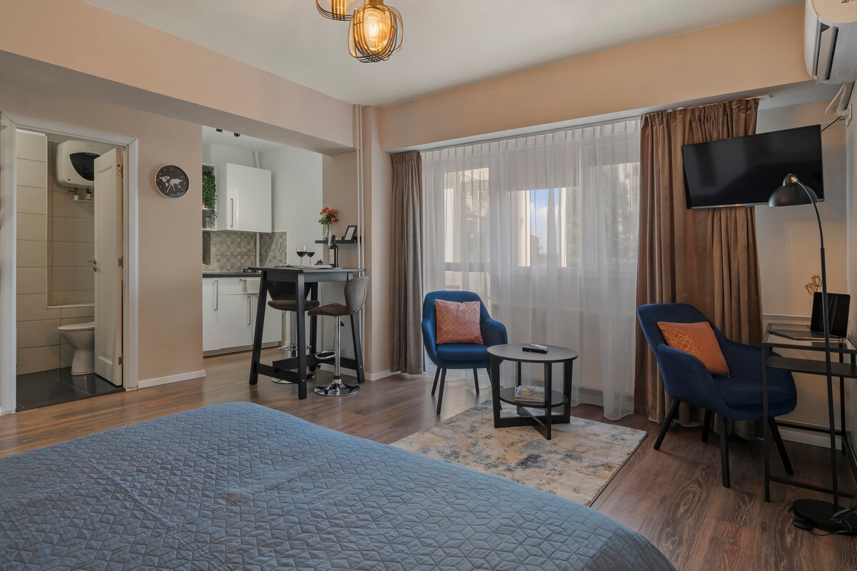 ¿Buscas un estudio fresco, cómodo y con un gran diseño en Bucarest? Situado en un edificio histórico en uno de los principales bulevares de Bucarest, «Now You See Me» es la opción perfecta para cualquier tipo de viaje. Elegante pero extremadamente cómodo, es un oasis para retirarse de las bulliciosas calles de la capital, ya que es un destino en sí mismo. Ya sea que estés buscando una escapada romántica, un lugar para trabajar de forma remota o simplemente estés aquí para disfrutar de la vida nocturna, «Now You See Me» es el hogar para ti.