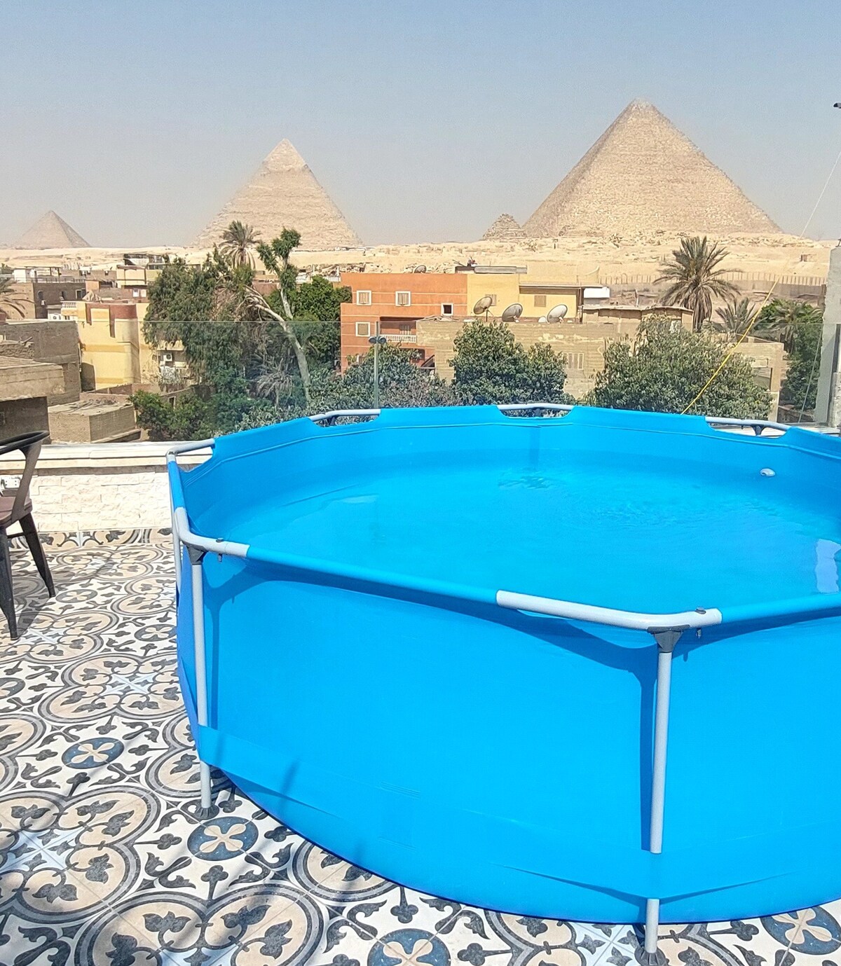 ¡Bienvenido a un retiro único a solo 5 minutos de las pirámides! Este estudio ofrece vistas panorámicas a la pirámide y un jacuzzi privado. El espacio cuenta con un diseño de inspiración faraónica, con una decoración única y detalles arquitectónicos que crean un ambiente histórico y acogedor. Disfruta de una cama tamaño queen, comedor, cocina pequeña y baño privado. Los huéspedes también tienen acceso a la azotea compartida con impresionantes vistas para una estancia inolvidable.