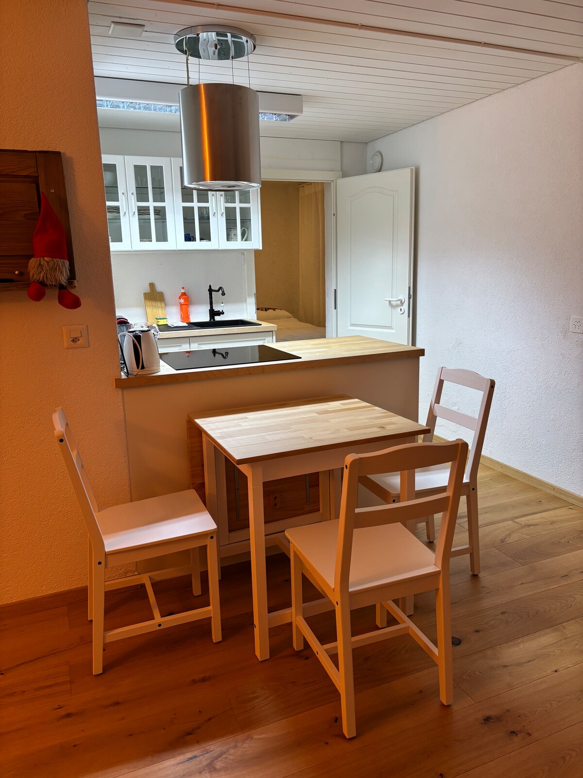 Precioso estudio con una acogedora estufa sueca. El calor básico también se puede calentar con madera para una calidez acogedora y un ambiente acogedor. (Madera incluida en el precio). En el pequeño dormitorio hay dos camas y un armario. La sala de estar de planta abierta con cocina integrada te invita a quedarte. Una cama antigua en la sala de estar se puede utilizar como otro lugar para dormir. Inodoro/regadera disponible. Asientos en el jardín
