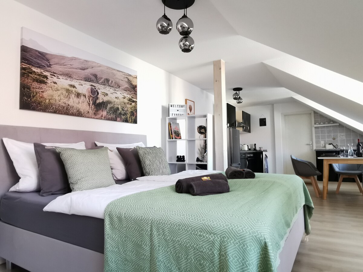 Apartamento amueblado con estilo en el tercer piso. El apartamento para una persona se puede utilizar como una cama doble si es necesario con una cama convertida (90 x 200 cm). Está equipada con un tocador, estantes y un armario. Hay wifi y TV inteligente disponibles. La cocina totalmente equipada ofrece encimeras, horno, nevera y congelador, cafetera y hervidor de agua. El baño con ducha ofrece toallas limpias, papel higiénico y espacio de almacenamiento.