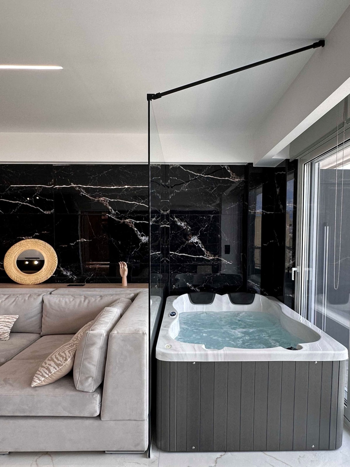 Bright skyline loft with private jacuzzi in Glyfada. Stylish 87m² top-floor space with large windows and open city views. Sleeps up to 4 (1 king bed + 2 sofa beds). Free minibar and fast Wi-Fi (Starlink). Walk to Glyfada center (800m) with restaurants, bars and shopping. Lidl, Adidas and Nike stores within 300m. Close to Voula, Vouliagmeni and Kavouri beaches and about 40 km from the Temple of Poseidon at Cape Sounion. Metro station about 2.5 km away. Easy free parking nearby.