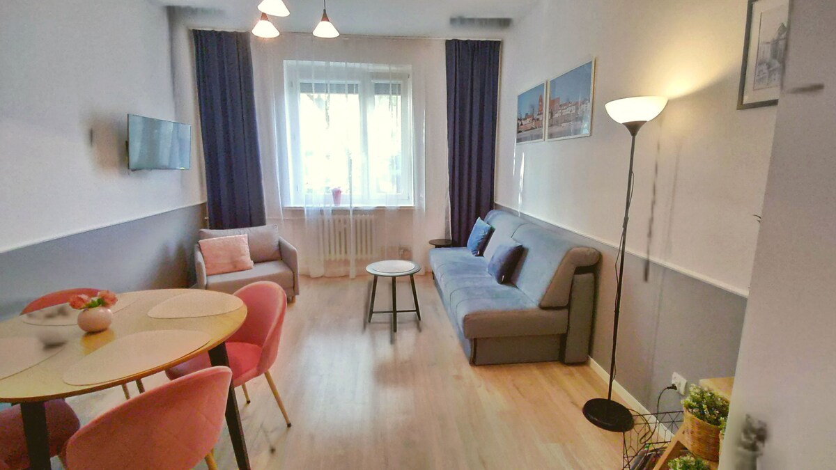 El apartamento está decorado con buen gusto, es espacioso, luminoso y funcional. Un amplio balcón te permite disfrutar del sol. Perfecto para una persona o una pareja. Se admiten mascotas, pero no dudes en ponerte en contacto con nosotros. Aparcamiento gratuito en una zona vallada o en la calle, wifi rápido, Android TV. El apartamento está situado cerca del casco antiguo y del río Vístula.