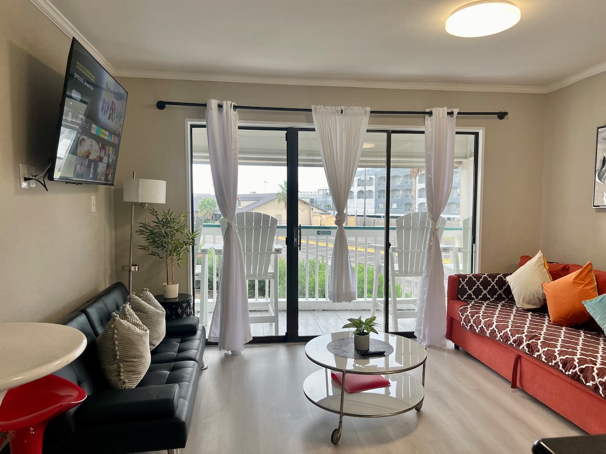 Apartamento recién renovado junto a la playa | A solo unos pasos de la arena >1 dormitorio – cama queen, TV inteligente >Capacidad para 4 personas – futón en el área de la sala de estar >Cocina – Elementos básicos para cocinar > Balcón privado con impresionantes vistas al mar > Baño moderno con ducha a ras de suelo > Servicios del centro vacacional: piscinas, jacuzzis, canchas de tenis >Ubicación privilegiada: camina hasta la playa, los restaurantes y las atracciones