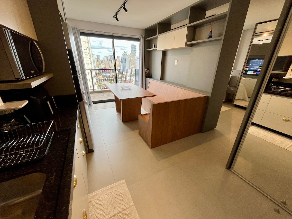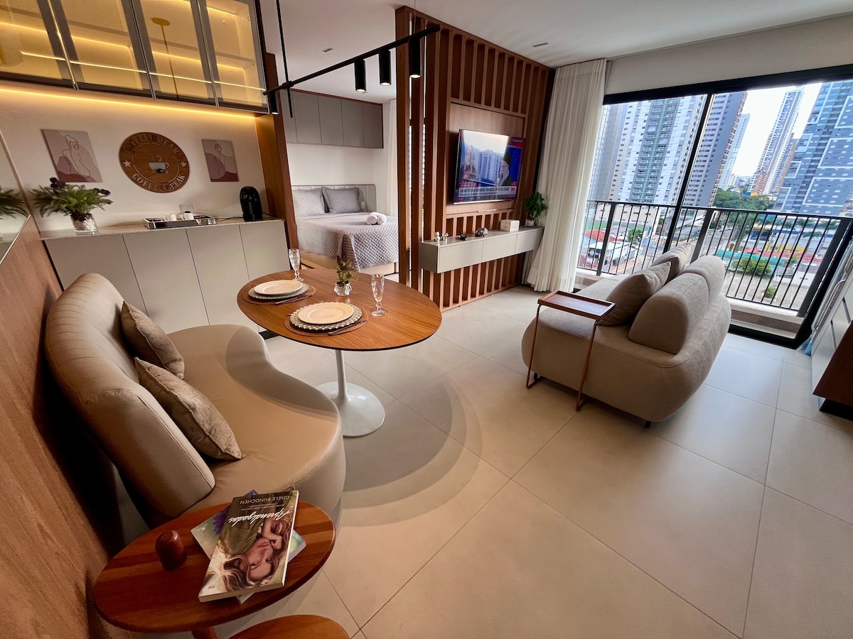 ❗️Un nuevo🤩 condominio único, elegante y sofisticado, hecho para que te sientas como en casa. Mira tu película favorita en el dormitorio o la sala de estar en el televisor inteligente giratorio más moderno con aire acondicionado, mesa de comedor y espacio de trabajo. ¡Descansa en la mejor cama, deleita con la ducha más deliciosa, disfruta del balcón y de una hermosa puesta de sol con vistas al parque y disfruta del contemporáneo Setor Bueno en la mejor región de Goiânia ! Condomínio Tai Residências