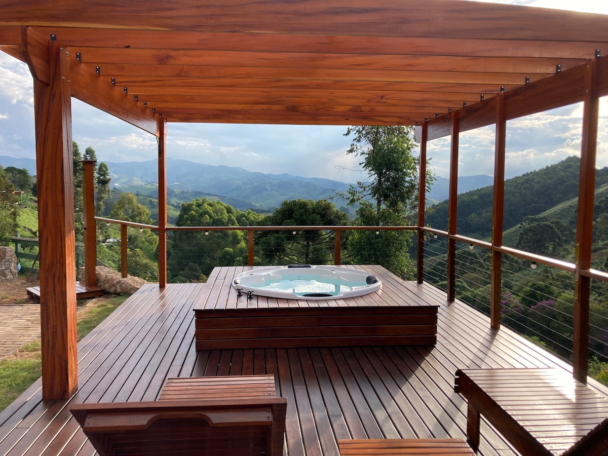 Lugar aconchegante . Localizada na porção superior de uma montanha com uma vista inspiradora. Anexo da minha casa, totalmente independente, inclusive a Hidro e piscina. Possui 2 suítes, cozinha gourmet americana, sala com TV SKY , WI-FI com Starlink (Alta velocidade) e aquecedores elétricos nos quartos. Do lado de fora, há uma piscina de borda infinita, hidromassagem, lareira de chão e total privacidade. À 900 metros do centro da cidade e totalmente asfaltada. Amamos animais !!! Nos consulte