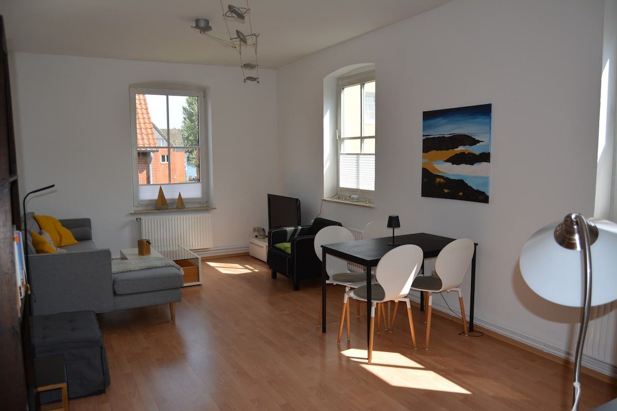 ¡Bienvenido a Studio N54/E9! Nuestro encantador apartamento está escondido en un patio tranquilo, justo en el corazón del casco antiguo de Eckernförde, a solo 150 m de la playa del mar Báltico, a 100 m de la estación de tren y el mejor sándwich de pescado al lado. Disfruta de la terraza de 75 metros cuadrados en la azotea con una tumbona o relájate en el jardín compartido con arenero, ideal para parejas o familias pequeñas.
