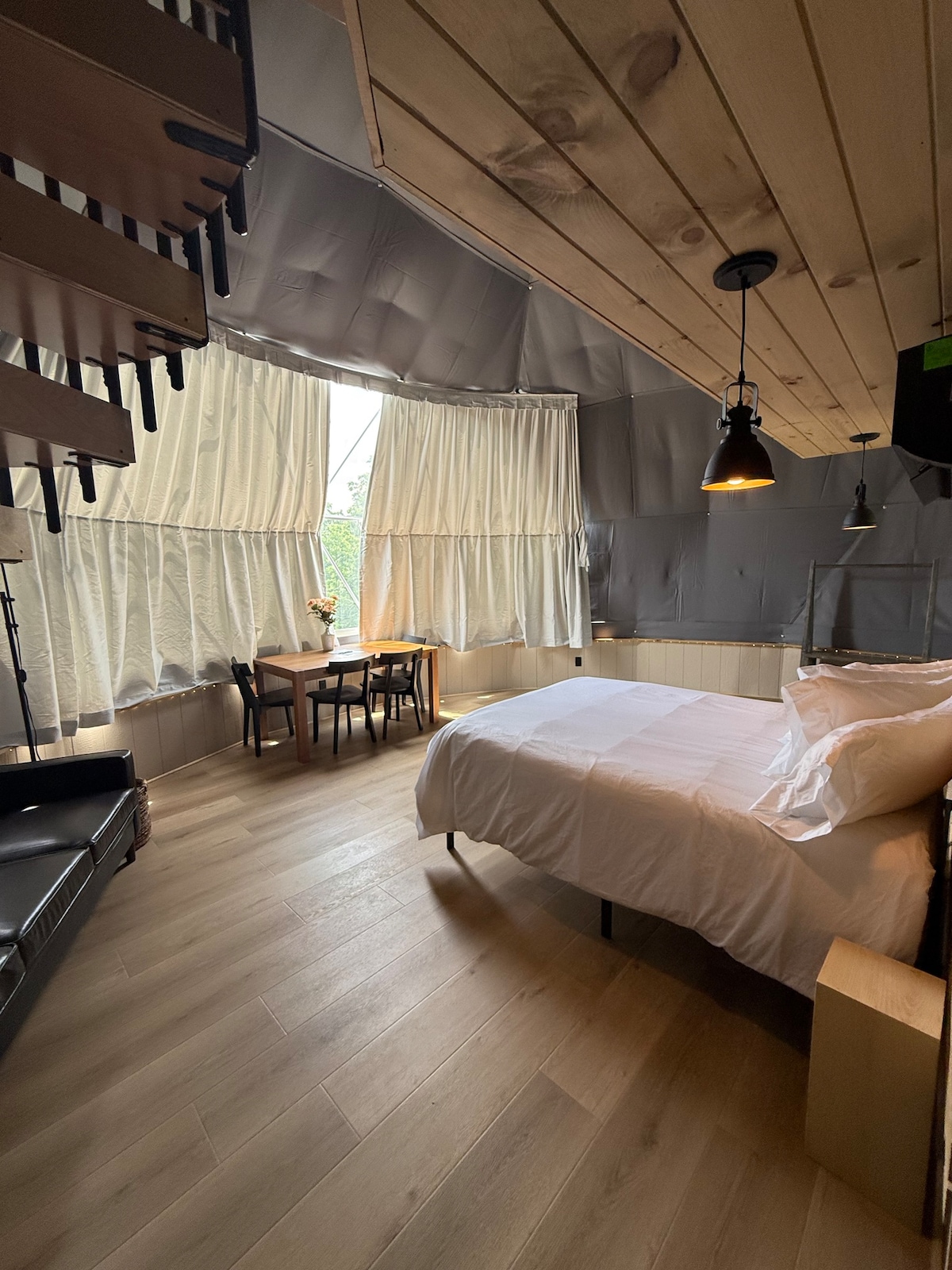 Settle into this welcoming glamping dome just minutes from the Ark Encounter. Thoughtfully designed for comfort and rest, it’s an easy place to slow down after a full day of exploring. What You’ll Enjoy: • Queen bed + twin beds • Private full bathroom • Kitchenette with cooktop, mini fridge & microwave • Heating & air conditioning • Outdoor fire ring for campfire evenings A quiet place to rest, recharge, and prepare for tomorrow.