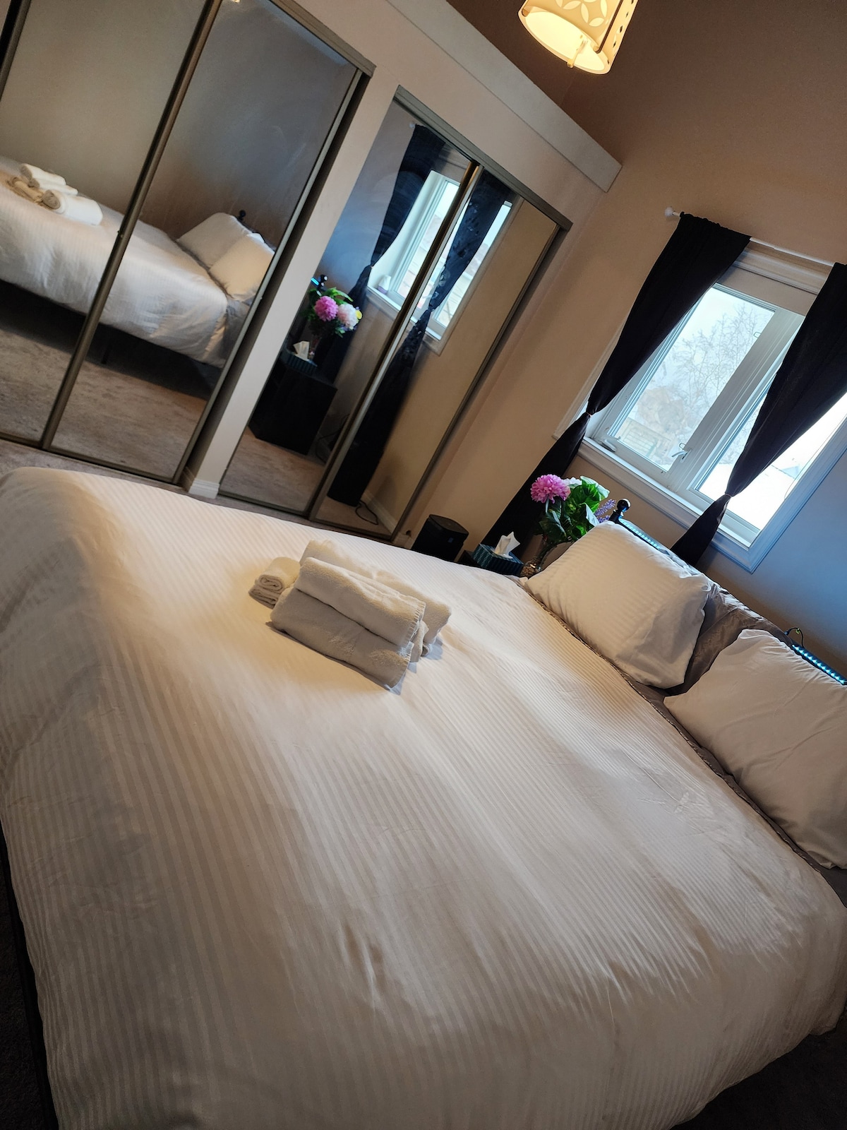 Alójate en un alojamiento espacioso y céntrico, a solo 6 minutos a pie del centro de Yellowknife. Disfruta de un dormitorio tamaño king con una terraza privada y un acogedor dormitorio tamaño queen, ambos decorados con buen gusto para tu comodidad. A pocos pasos de restaurantes, tiendas de comestibles y atracciones locales. Relájate en la cubierta y, si tienes suerte, contempla la danza de la aurora boreal en el cielo nocturno. ¡Perfecto para viajes de trabajo y escapadas al norte! 🌌