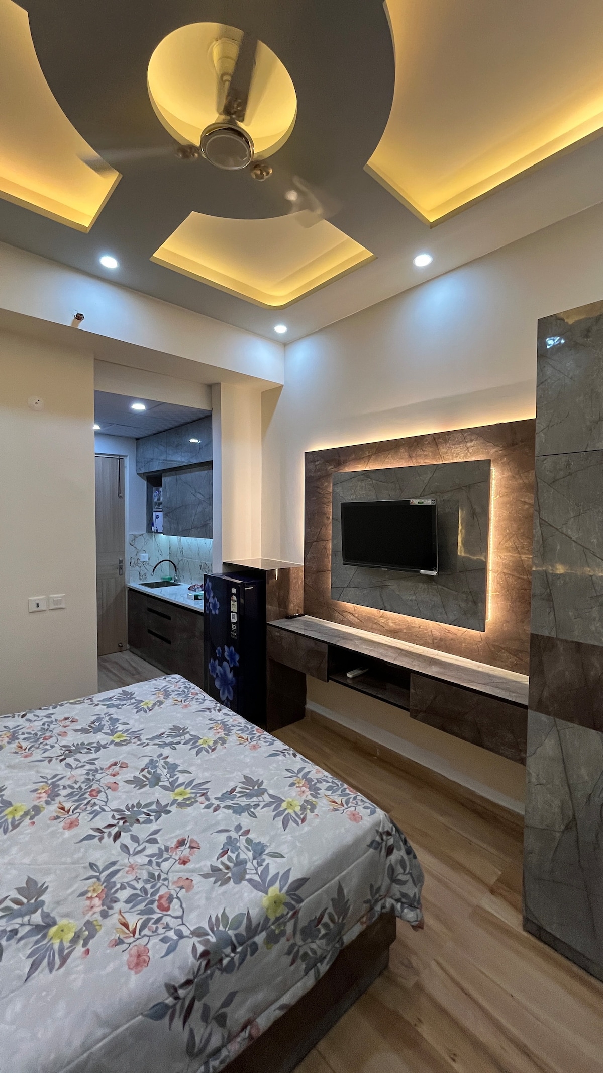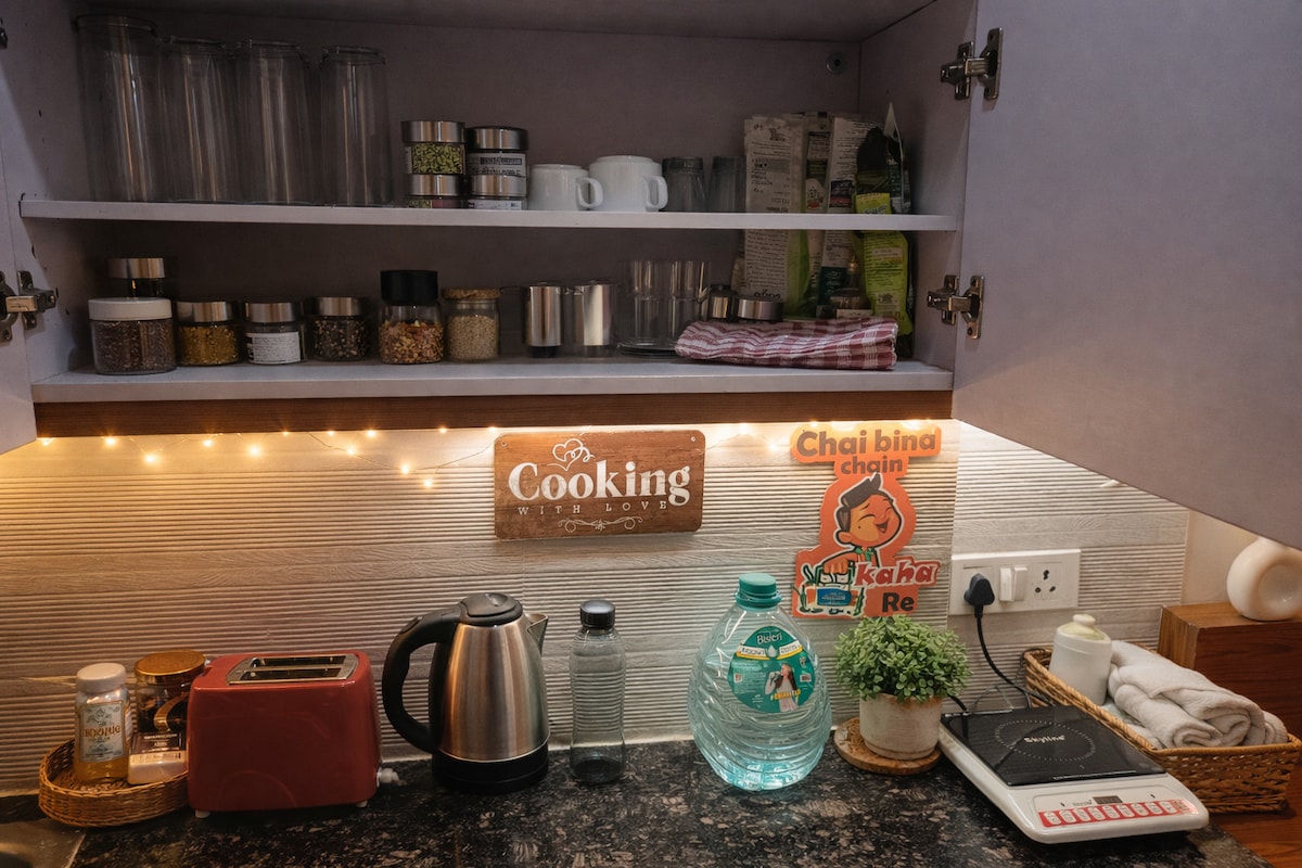 A couple friendly Private apartments, a king-sized bed, and a fully-equipped kitchen. Enjoy seamless connectivity with fast WiFi and stay entertained with our sleek smart TV with free access to OTTs. Complimentary amenities include an Electric Kettle, Microwave, Induction cooktop and toiletries - your home away from home! Daily cleaning is available and the timings are (11 AM to 6 PM) Compulsory ID proof (Adhaar/DL/Passport) required for all guests before check-in.