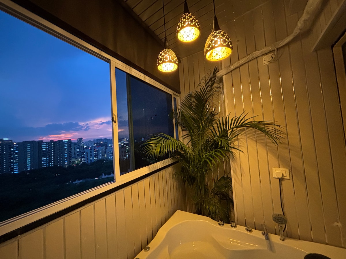 Ubicado en el piso 25 con un impresionante panorama de la ciudad, Skyline Serenity te invita a experimentar la vida urbana en todo su esplendor. Como anfitrión en Airbnb, estoy encantado de proporcionarte un alojamiento que trasciende lo ordinario, ofreciendo una combinación perfecta de comodidad, estilo y las vistas más impresionantes de la ciudad en las que hayas visto en Noida. No son solo vistas; son una sinfonía visual que se despliega ante ti. La energía dinámica de la ciudad será tu acompañante constante.