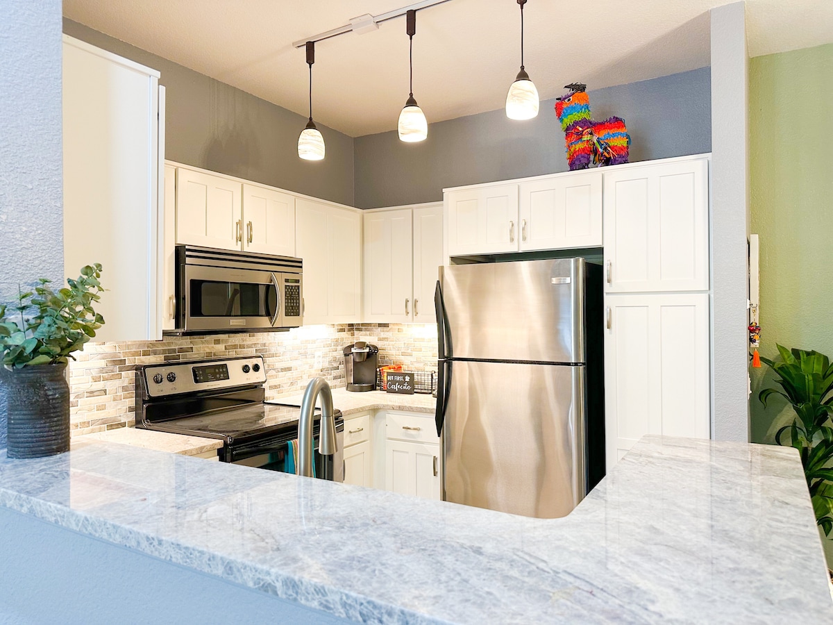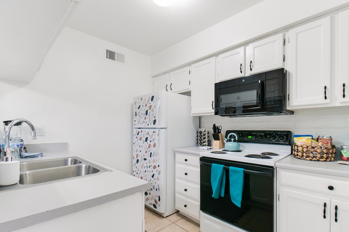 Amplia casita cerca de Ventana Canyon que cuenta con dos dormitorios, planta baja sin unidad encima, encimeras de granito, wifi, Directv con paquete Premier (el dormitorio principal y la sala de estar tienen cable), un patio privado con parrilla y una plaza de aparcamiento cubierta. Para estancias largas (más de un mes), ¡envíame un mensaje y podemos negociar las tarifas! La unidad está equipada con: - Sistema de ósmosis inversa - Televisor inteligente 4K - Cafetera - Horno tostador - Licuadora - Cocina totalmente equipada con utensilios de cocina.