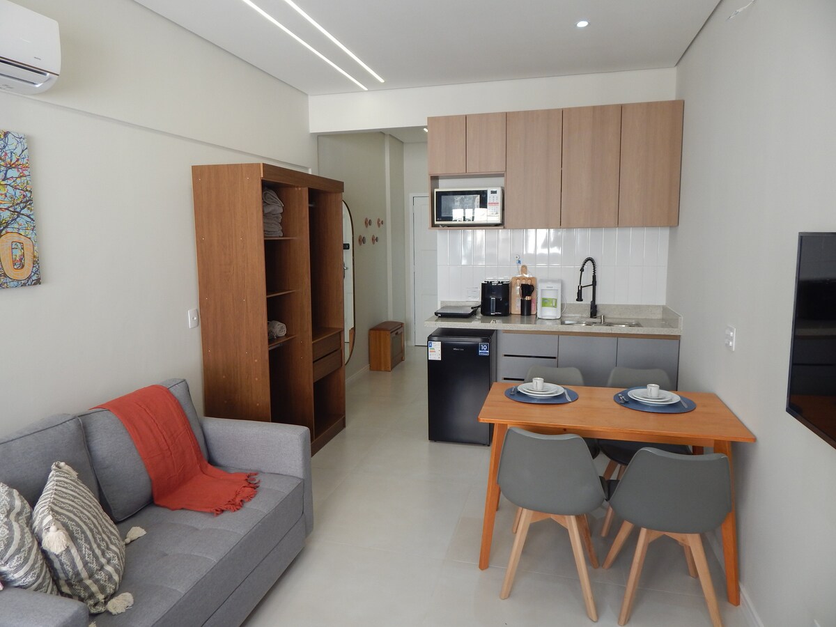 El departamento ofrece: • 1 dormitorio con una cama tamaño queen. • Aire acondicionado en el dormitorio y en la sala de estar - Wifi de 500 ! Televisión inteligente con Netflix, Globoplay y Amazon Prime • Mesa de comedor con dos sillas - Cocina completa (Nespresso, sándwich, minibar). • Baño (secador de pelo, artículos de tocador) • Plancha para ropa • Lavadora y secadora • Sala de estar con sofá • Ubicada en la calle del hotel Fasano.