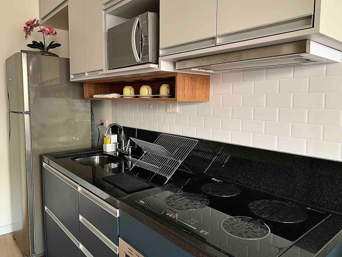 Nuevo 1 dormitorio,muy acogedor con: *Garaje, *Gimnasio, *Piscina, *BBQ , * Conserje y seguridad las 24 horas El apartamento está en el barrio más famoso y moderno de Guarulhos. Cuenta con varias opciones gastronómicas y de entretenimiento en el espacio del complejo. Se encuentra a solo 200 metros del verde Bosque Maia y a 9 km del aeropuerto de Guarulhos. Nuestro espacio tiene 1 cómoda cama doble, un sofá en el salón y ofrecemos aire acondicionado, televisores, wifi y ethernet.