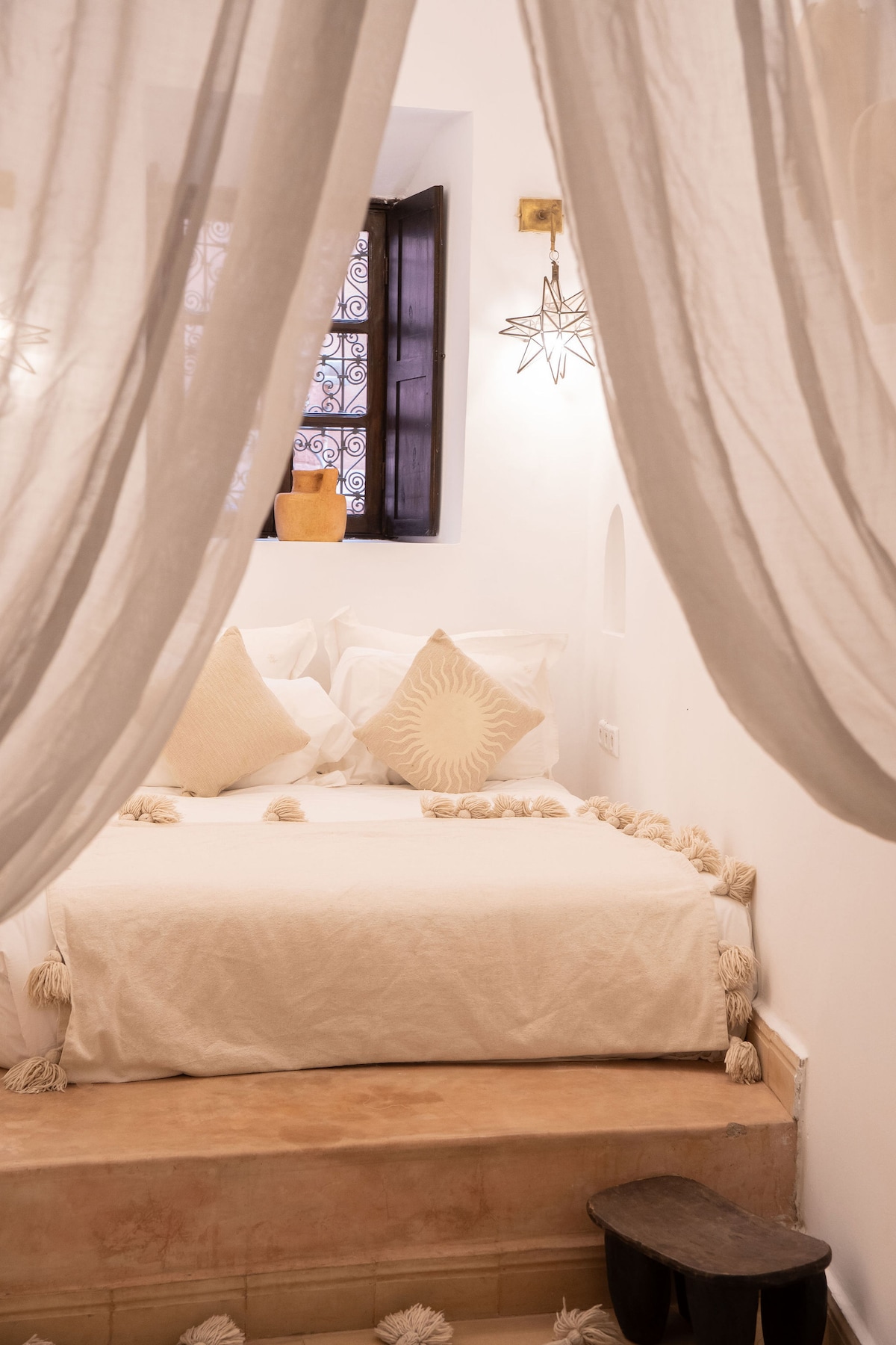 Esta romántica habitación con cama tamaño king y baño privado en el corazón de la medina es una de las cinco habitaciones del Riad Chekaram (consulta nuestros otros anuncios para habitaciones alternativas con cama tamaño king, doble o dos camas individuales). Un tradicional bed & breakfast de habla inglesa, diseñado con cariño por artesanos de nuestra zona, somos el refugio perfecto para explorar la medina de Marrakech. Chekaram se puede reservar en Airbnb por habitación individual o como casa completa para grupos de hasta diez personas que buscan una experiencia marroquí especial.