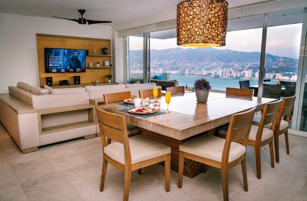 Lujoso departamento 100% equipado Seguridad 24/7 4 habitaciones, todas con baño y A/A La mejor vista de la Bahía 2 huéspedes hasta 12 con diferentes tarifas 7 albercas (1 de adultos 1 toboganes) A 5 min de los mejores lugares Zibú Muna Despecho Siroco y más A 10 minutos de la playa Golf Vidanta (precio especial) Princes Turtle Dunes 3 vidas Club de golf Acapulco Servicio de limpieza incluido (4 horas de servicio p/d) Cocinera Costo extra Tu primer desayuno de cortesía. (1 a elegir)