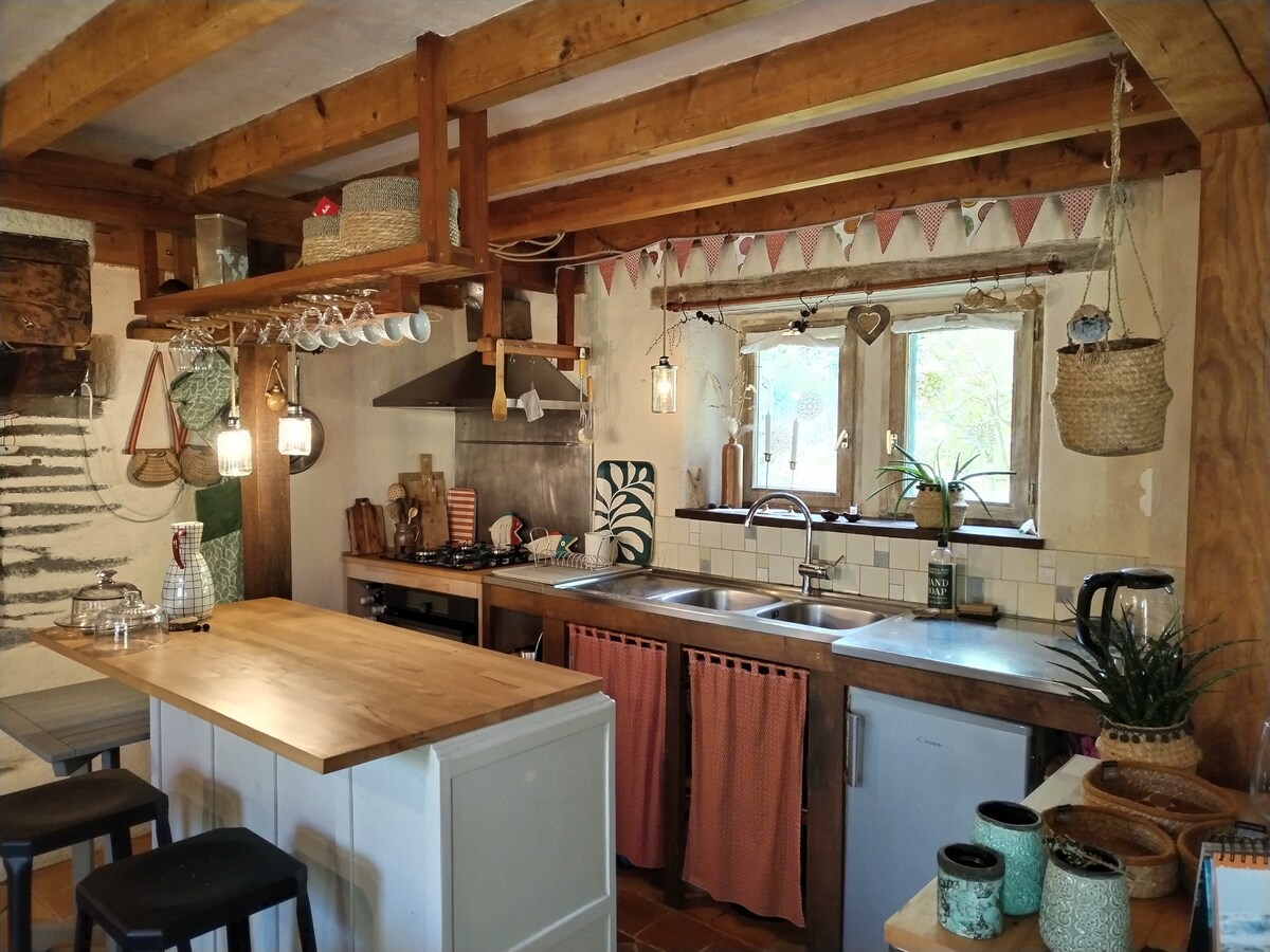 Esta casa de campo en el corazón de un pueblo, tiene una habitación principal con una zona de cocina (placas de inducción, horno mixto, nevera), un sofá, una mesa (plegable) con 4 sillas, un baño, y un gran dormitorio de arriba, una mesa que se puede utilizar para trabajar ( wifi de buena calidad), una cómoda, un armario. Posibilidad de comer fuera y utilizar la piscina.