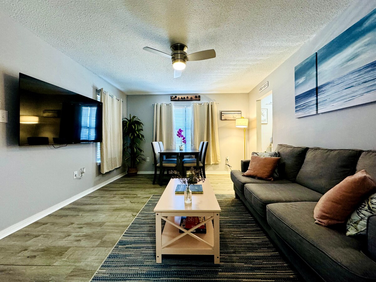 Relájate y desconecta en este espacio acogedor, elegante y muy acogedor. Esta unidad ha sido completamente renovada y actualizada con toques de lujo modernos para que tu estancia sea más cómoda. Este alojamiento también está orientado al sur con una ligera vista a la playa y brisa marina. La unidad está en el último piso (escaleras) y retrocede a los buzones, cuando las persianas están abiertas, ¡los hermosos árboles son la vista! TV inteligente de 50 pulgadas, equipado con Amazon Firestick, encimeras de cuarzo, wifi 5G y wifi normal disponible