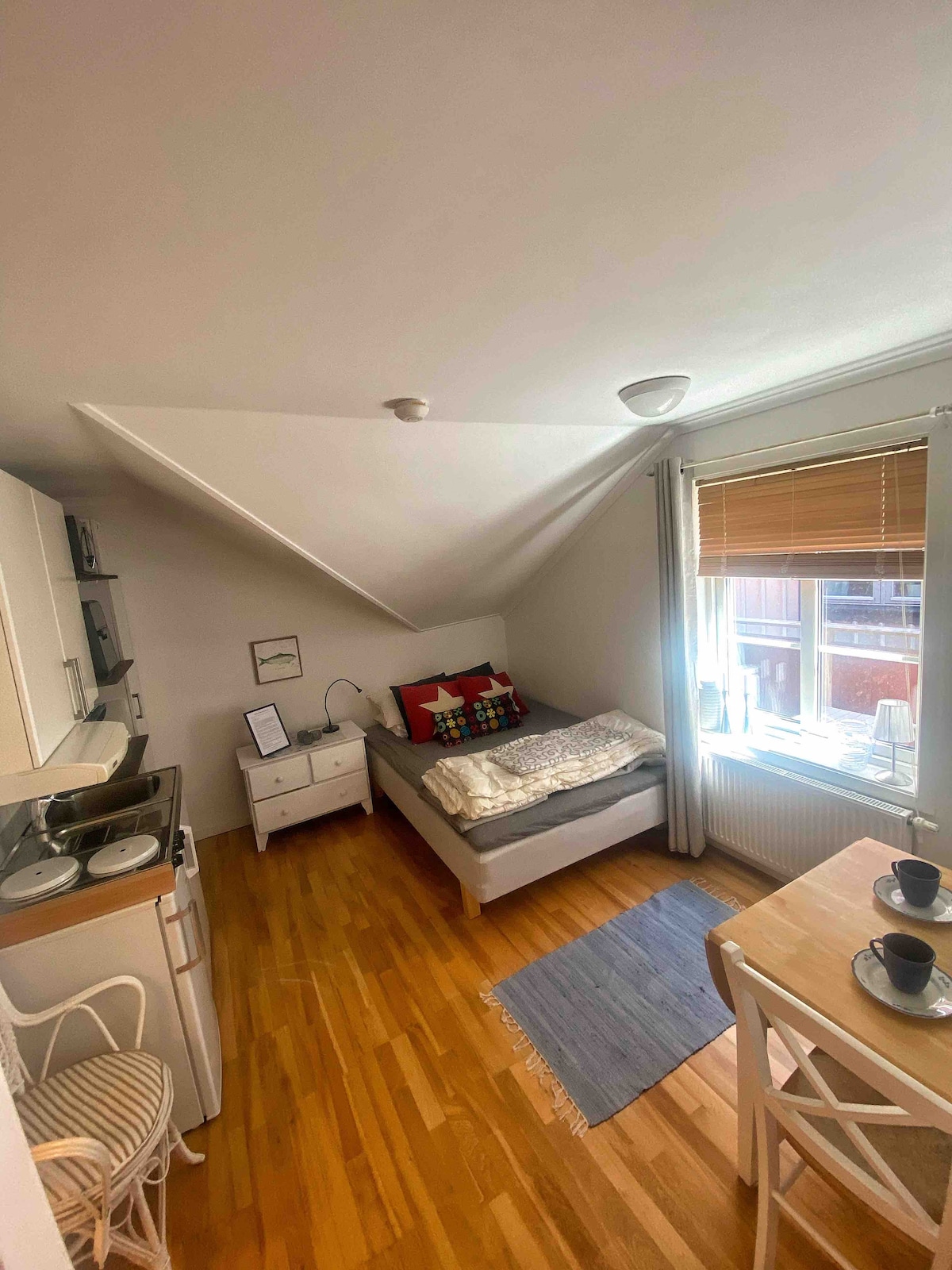 Charmig nyrenoverad 2:a på ca 40 kvm i del av hus i Gamlestan, Norra hamnen. Här bor du med promenadavstånd till bad, restauranger och strandpromenad. Ljus och fräsch lägenhet med havsutsikt från kök och sovrum samt en liten innergård – perfekt för morgonkaffet. Lägenheten har egen ingång och ligger på ovanvåningen. Under vissa perioder bor värdar med barn på nedervåningen (v27-32, vissa helger). Vardagliga ljud kan ibland höras, men vi är måna om att din vistelse ska vara lugn och trivsam.