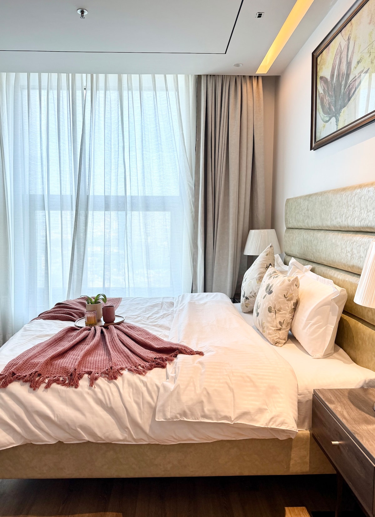 Welcome to this another luxurious property by Tulip Homes which is situated on 12th floor of a High-rise building. Wide garden patio & 2 seater jacuzzi makes it unique in class. The place is perfect for relaxing and enjoying scenic view of modern architecture. Apartment is loaded with smart tv (all applications works), big mirror wall, a cozy double bed, comfy swing, stylish couch with central nesting coffee tables, fridge, microwave, induction,electric kettle, toaster, iron & many more.