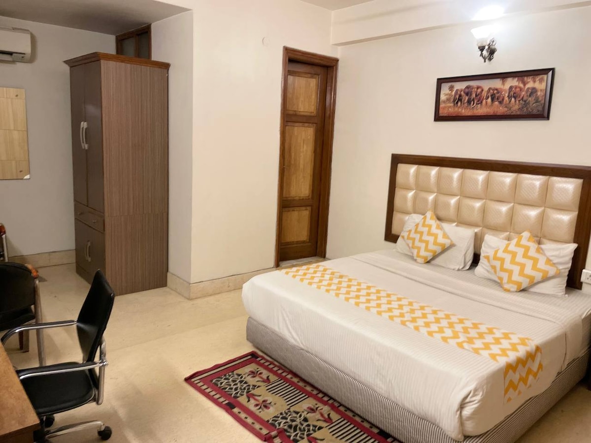 ¡Bienvenido a tu hogar lejos de casa! Nuestra habitación tamaño queen de lujo ofrece una mezcla perfecta de lujo, comodidad y conveniencia. Alójate a pocos minutos del Hospital Artemis, la carretera del campo de golf y la estación de metro Sector 54 Chowk, lo que garantiza una conexión perfecta con la ciudad. Damos la bienvenida a ciudadanos extranjeros.