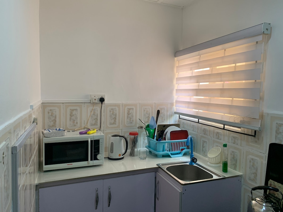 Este anuncio es un apartamento de un dormitorio céntrico y terminado con buen gusto para garantizar una estancia cómoda. El apartamento está equipado con energía de respaldo para garantizar la fuente de alimentación las 24 horas, los 7 días de la semana, limpieza diaria, wifi, cocina totalmente equipada y un espacio de trabajo dedicado. El apartamento tiene una ubicación céntrica y es fácil acceder a los principales restaurantes, mercados, centros comerciales y la zona central de Abuja con un tiempo de ruta muy corto.