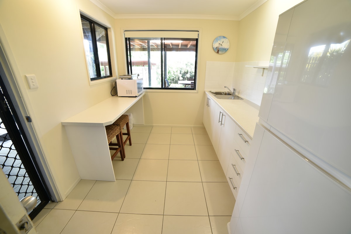 Una habitación limpia, cómoda y con aire acondicionado, de estilo motel, en la planta baja de nuestra casa de 2 pisos. Esta habitación consta de tu propio patio privado y entrada, un dormitorio grande con una cama tamaño queen, té y café de cortesía, una nevera pequeña, un salón, TV y un baño grande. No hay espacios compartidos ni utensilios de cocina. Rodeado de preciosos jardines tropicales, este alojamiento es perfecto para una escapada rápida, en la hermosa Rainbow Beach, o como escala en tu camino a la isla Fraser.